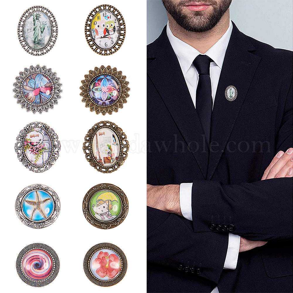 • Антично-бронзовый и Антично-серебристый Сделай сам брошь, литые брошь кабошон настройки оправы с прозрачными стеклянными кабошонами, античная бронза и старинное серебро, 25x18x5 мм, Установка кабошона в оправу: 10шт./комплект, стеклянные кабошоны: 10шт./набор