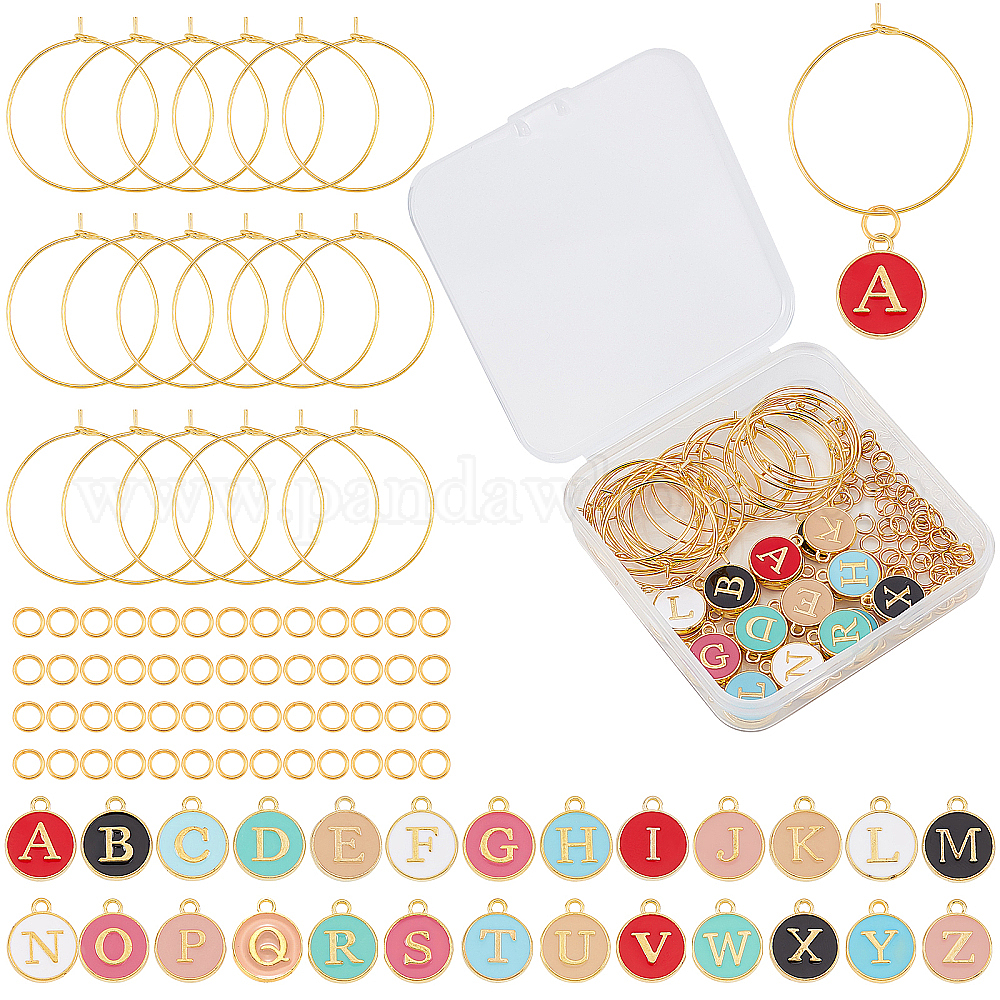 Наборы для самостоятельного изготовления украшений для бокалов, в том числе 1 набор плоских круглых с эмалевыми подвесками из сплава алфавита, 26 шт. Латунные кольца-подвески для бокалов для вина и 60 шт. Железные прыжковые кольца, золотые