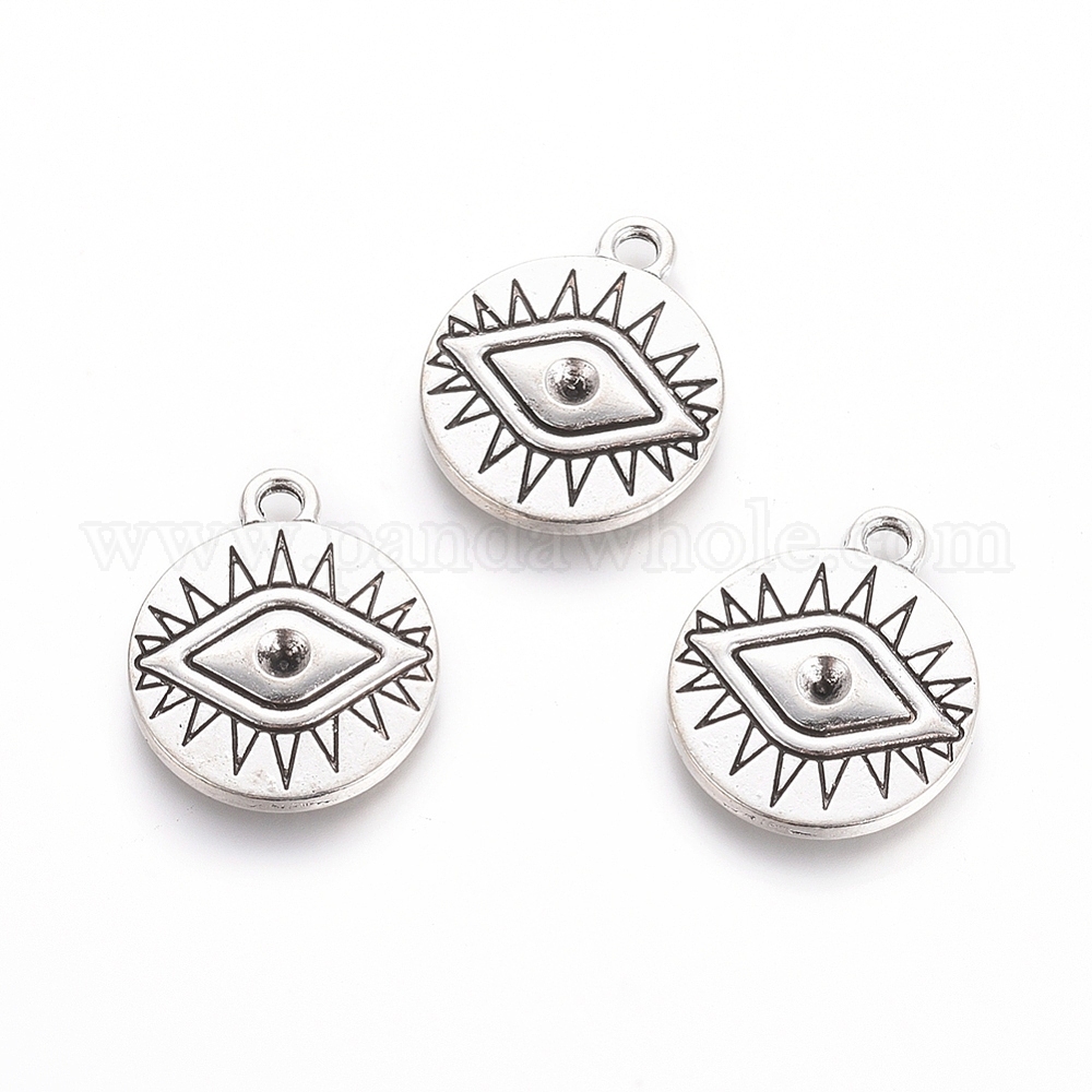 • Античное Серебро Стойки плакировкой тибетского стиля сплава кулон настройки горный хрусталь, плоские круглые с сглаза, античное серебро, 19.5x15.5x2 мм, отверстие: 1.5 мм, подходит для страза ss 3.5 (1.4~1.5 мм)