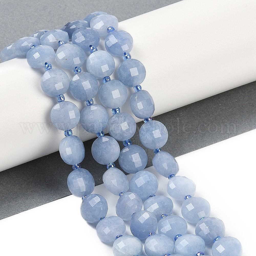 Бусины из натурального белого нефрита, окрашенные, имитация аквамарин, граненые, плоско-круглые, с бисером