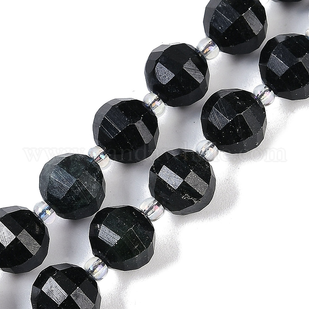 Нити бусин из натурального черного нефрита, граненые, фонарь, с бисером (02YSX5)