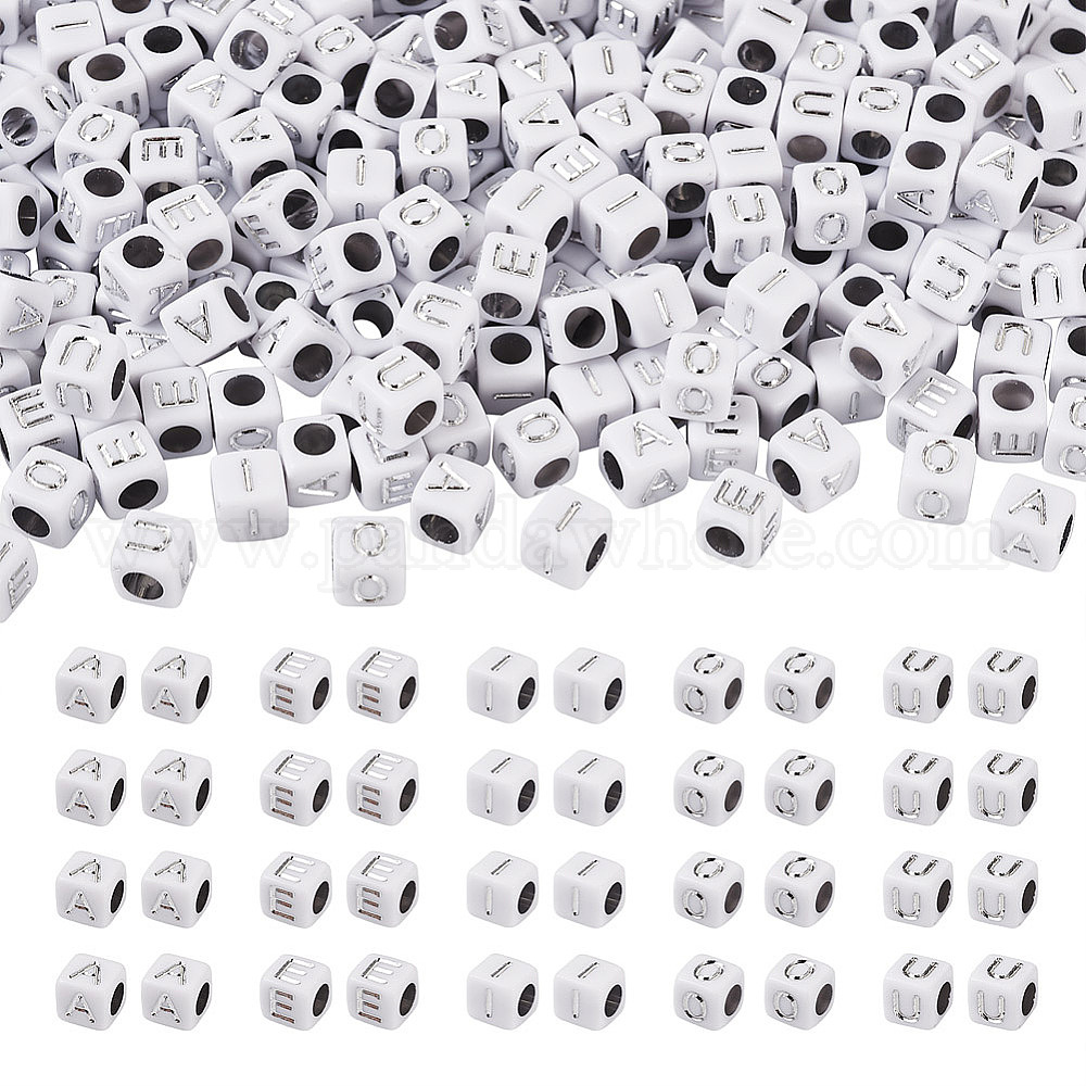 500 шт 5 непрозрачные акриловые бусины в стиле, белый куб с серебряной буквой.a, буквой.e, буквой.i, буквой.o и буквой.u
