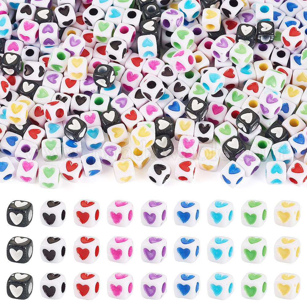 900 шт 9 цвета непрозрачные акриловые бусины, Куб с сердцем