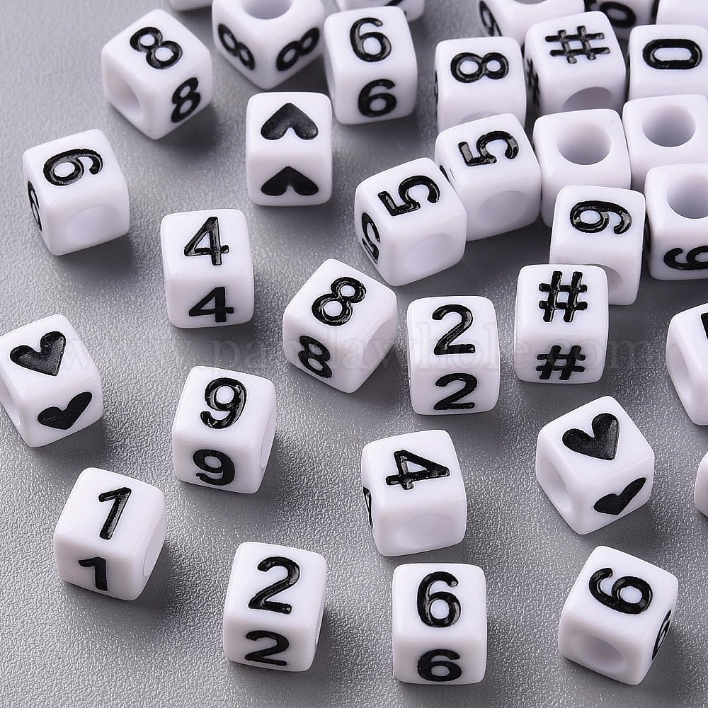Непрозрачные белые акриловые бусины, куб с черным числом и сердцем