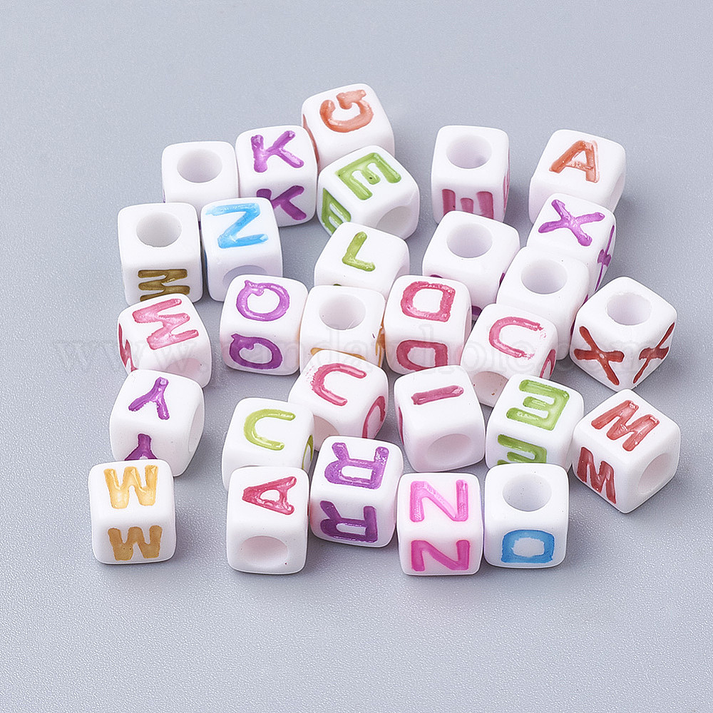 Акриловые бусины, горизонтальное отверстие, куб с разноцветными буквами