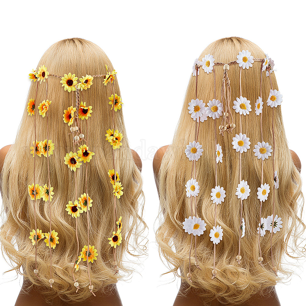 2 шт 2 цвета ткань подсолнечник хиппи повязка на голову цветочная корона, свадебная вечеринка пляж свадебные декоративные аксессуары для волос украшение для волос в виде лозы