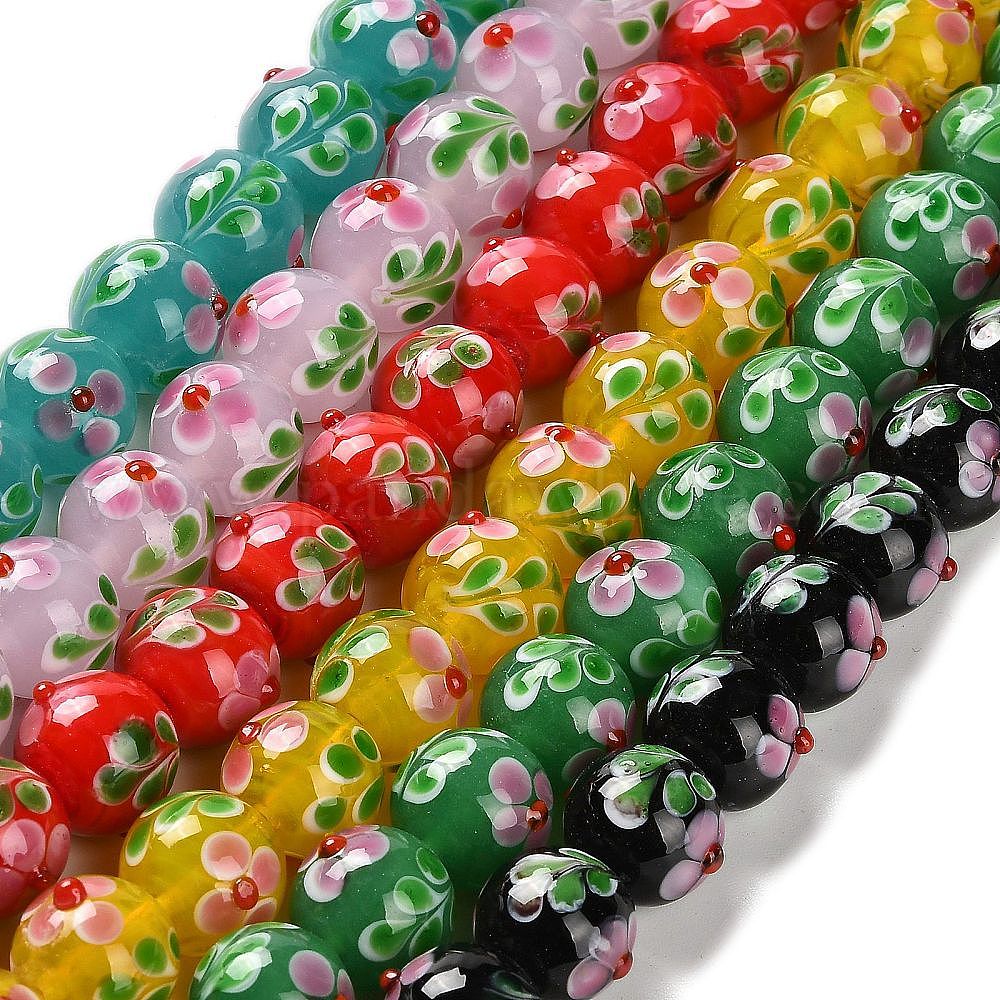 Нити бугорчатых бусин ручной работы в технике лэмпворк, круглые с цветочным узором
