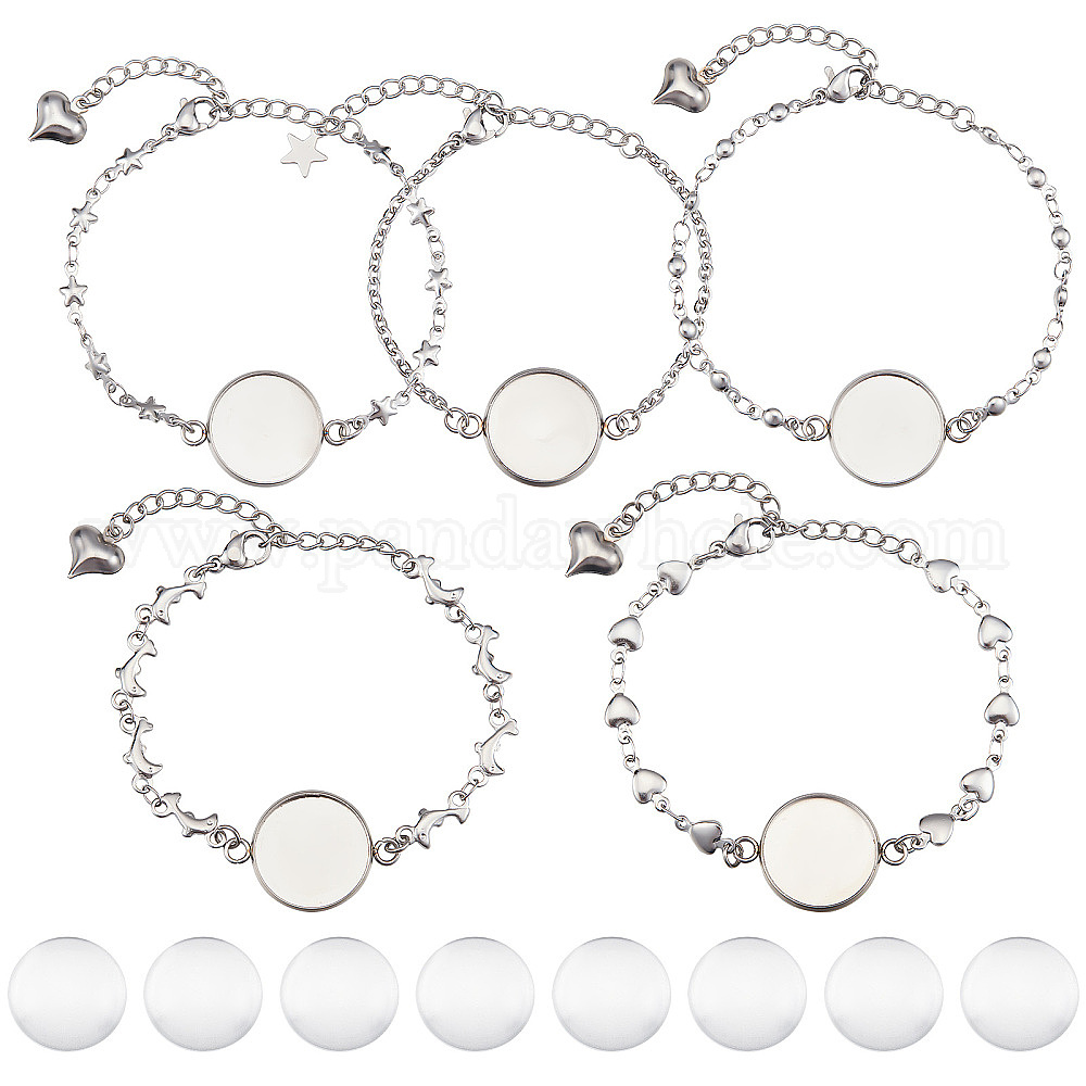 10 шт 5 стиль 304 изготовление фотобраслетов из нержавеющей стали, с карабин-лобстерами , цепочки и плоские круглые кабошоны, разнообразные, с 10 прозрачными стеклянными кабошонами