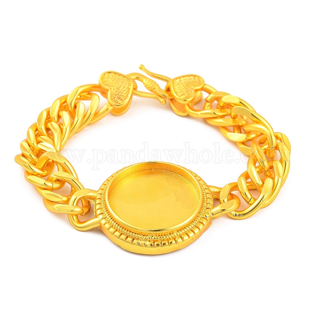 • Матовый Золотой Цвет Браслеты-цепочки из латуни с кубинскими звеньями, плоский круглый поднос для кабошонов, с сердечными застежками, без свинца и без кадмия, матовый золотой цвет, лоток : 25 мм, 7-1/2 дюйм (19 см)