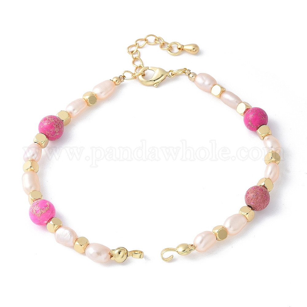 Изготовление браслета из круглых бусин из латуни, натурального жемчуга и окрашенной ярко-розовой императорской яшмы, с латунным когтя омара застежками и удлинителей цепей, стойки покрытие, долговечный, без кадмия и без свинца