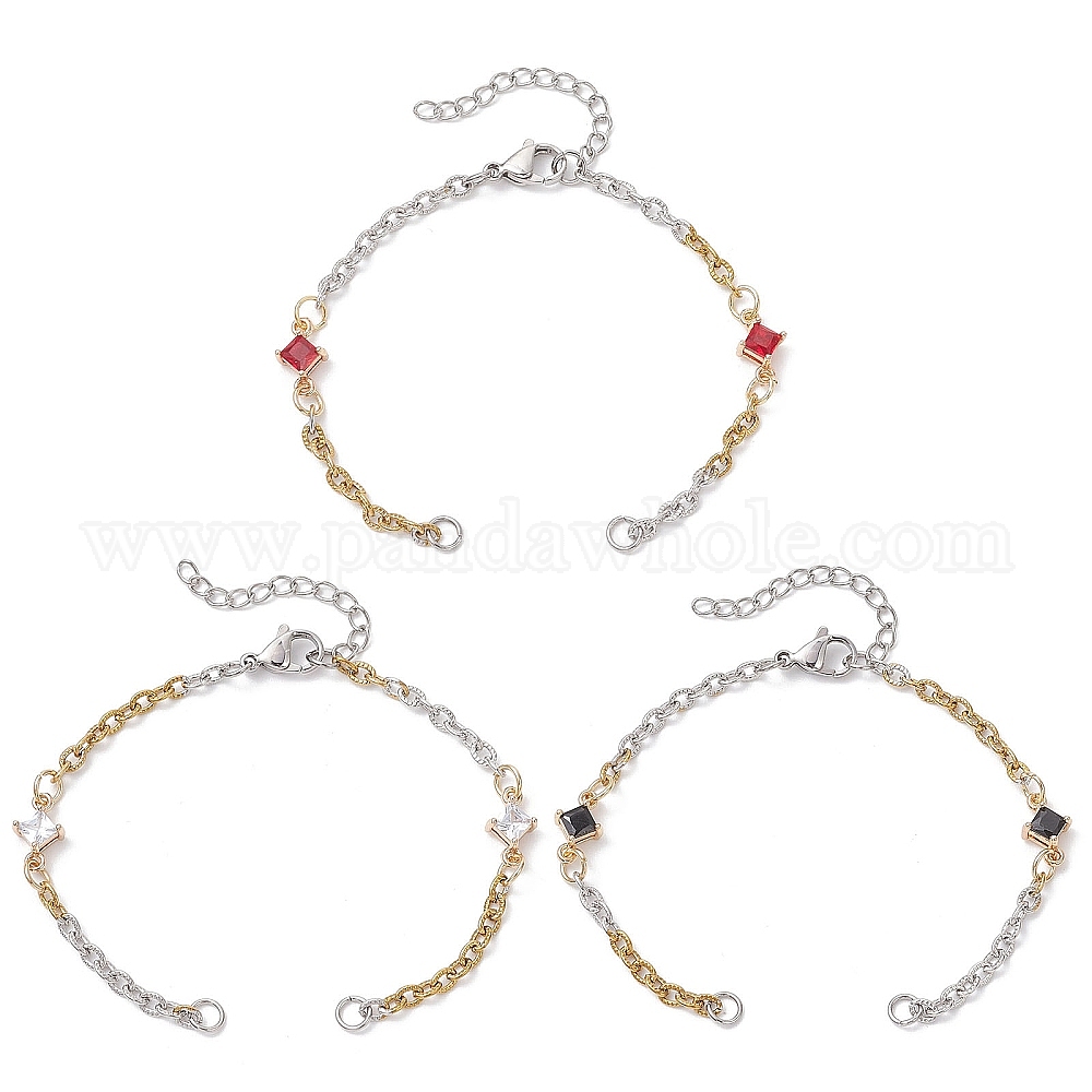 3 шт. 3 стили 304 изготовление браслета-цепочки из текстурированной нержавеющей стали, с латунным паве из стеклянного ромба, разноцветные