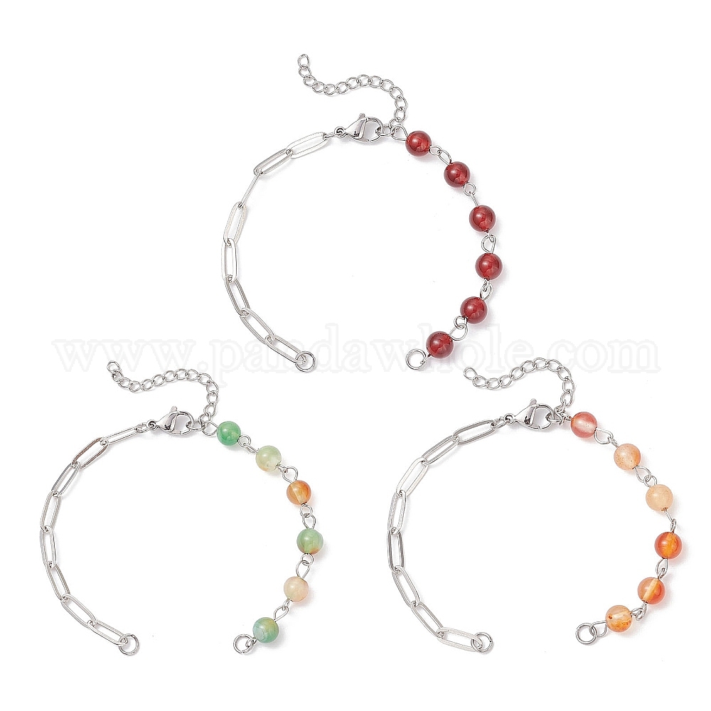 3 шт. 3 стили: круглый, окрашенный натуральный красный агат, павлинье-зеленый агат, сердолик и латунный браслет-скрепка, с 304 концевыми цепями из нержавеющей стали