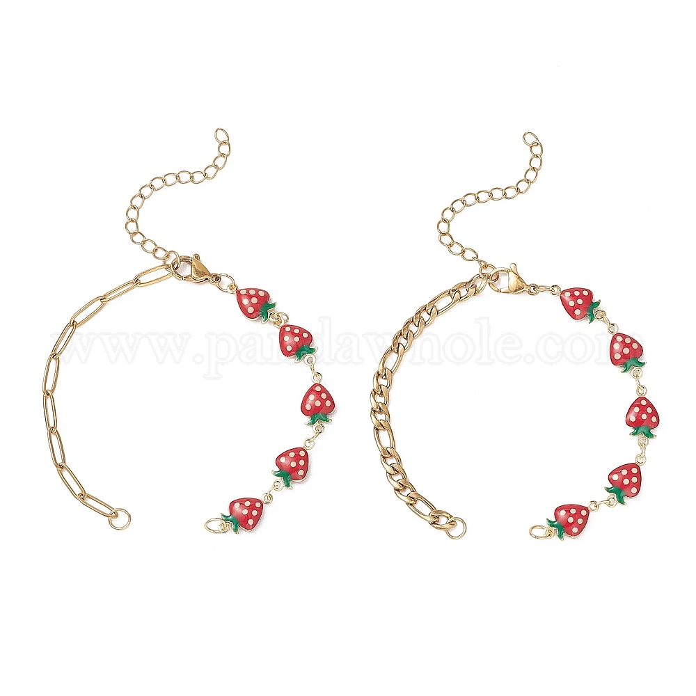2шт. 2 стили латунный эмалированный красный клубничный браслет-цепочка для изготовления, с 304 цепями из нержавеющей стали и 304 застежками из лобстера из нержавеющей стали