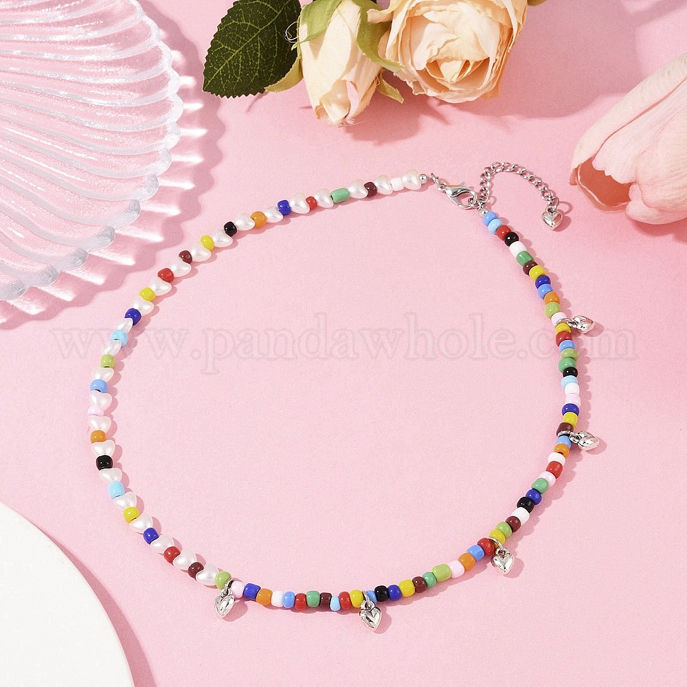 Ожерелья из круглого стеклянного бисера в стиле бохо с подвесками в виде сердечек из сплава античного серебряного тона