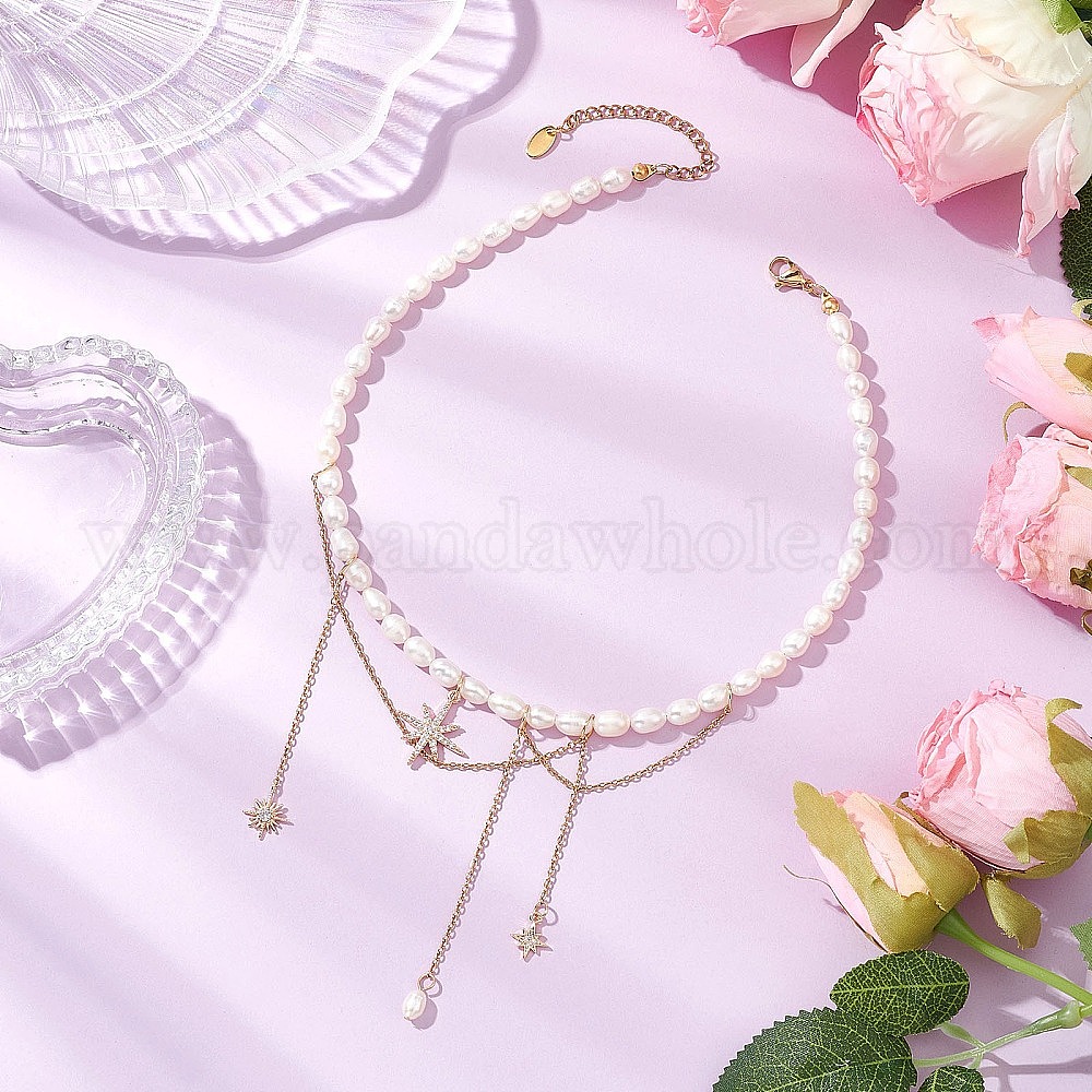 Ожерелья из натурального культивированного пресноводного жемчуга и рисовых бусин, с подвесками в виде звезд из латунного микропаве из прозрачного кубического циркония и 304 концевыми цепочками из нержавеющей стали, белье