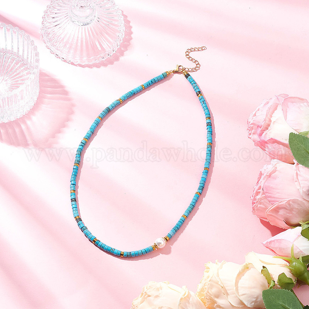 • Средний Бирюзовый Ожерелья из круглых ракушечных жемчужин и окрашенного натурального магнезита в стиле хейши, золотые, средне бирюзовый, 16.34 дюйм (41.5 см)