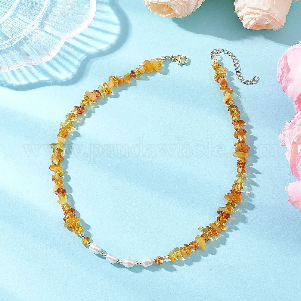 Ожерелья из натурального жемчужного риса и натурального янтарного бисера., с 304 из нержавеющей стали Lobster Claw застежками, золотые