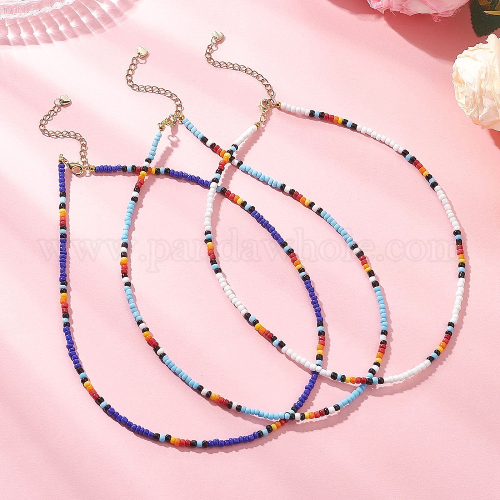 3шт. 3 цвета круглые стеклянные бисерные ожерелья, с латунными застежками-карабинами и 304 удлинителями цепочки из нержавеющей стали, золотые