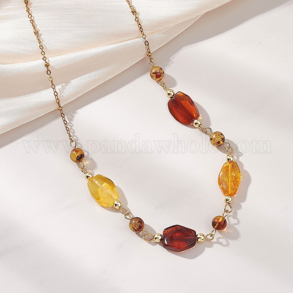 • Золотой Ожерелья из натуральных янтарных самородков с бусинами и цепочками из нержавеющей стали., золотые, 304 дюйм (15.04 см)