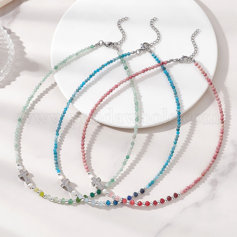 Ожерелье из натуральных смешанных камней, ограненных в круглые формы, и окрашенного малазийского нефрита и жемчуга с крестом из прозрачного кубического циркония, украшенным микропаве., платина