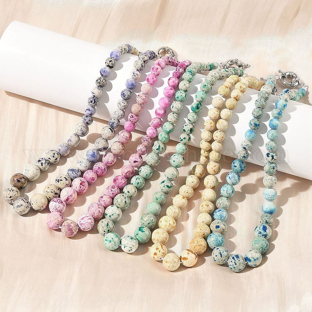 Ожерелья из окрашенных натуральных окаменелостей, круглые, градуированные по цвету., с пружинными застежками из платиновой латуни