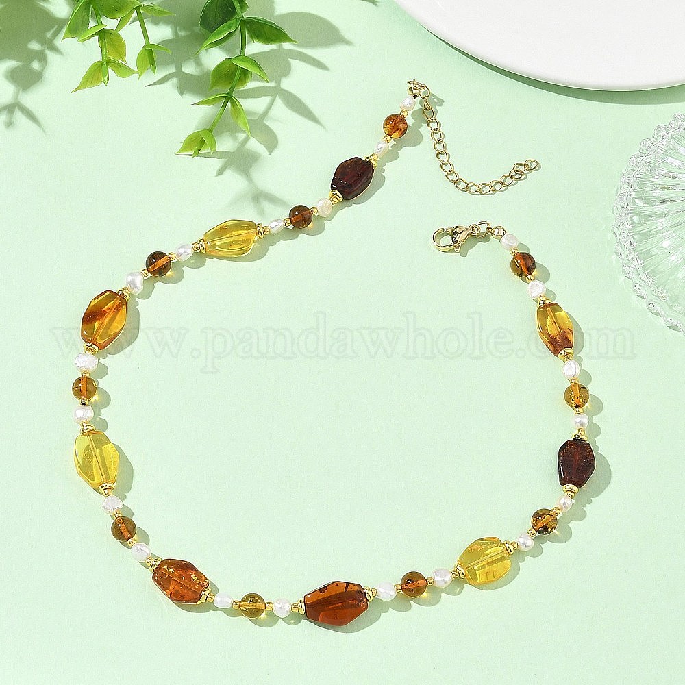 • Золотой Ожерелья из ромбовидных и круглых стеклянных бусин с градиентным цветом, выполненные из натурального янтаря, с цепочками из нержавеющей стали., золотые, 304 дюйм (15.08 см)
