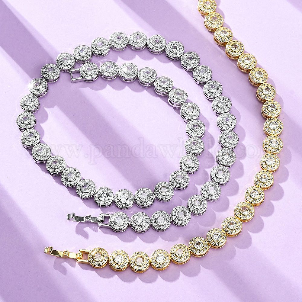 Латунные ожерелья с плоскими круглыми звеньями из прозрачного кубического циркония для женщин, без свинца и без кадмия, стойки покрытие