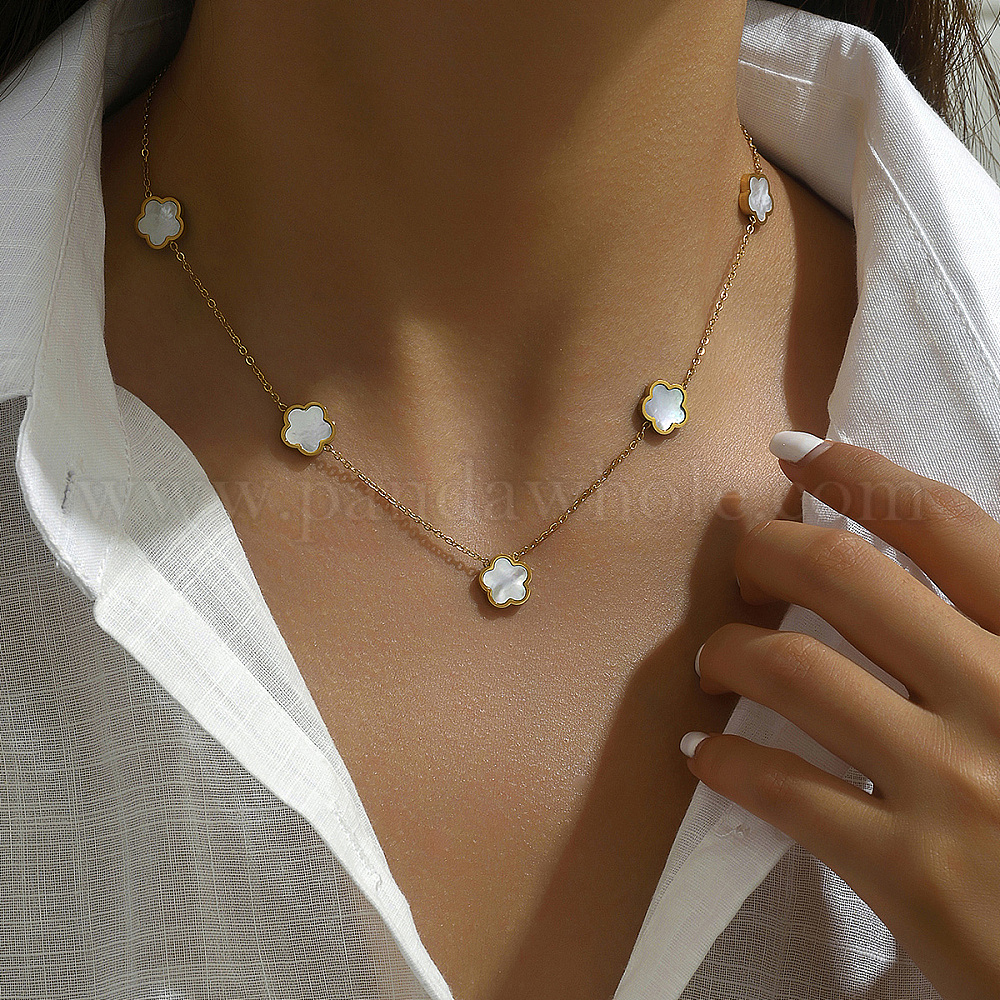 • Белый Элегантные ожерелья из нержавеющей стали с ракушками и цветочными звеньями для женщин, золотые, белые, 16.14 дюйм (41 см)