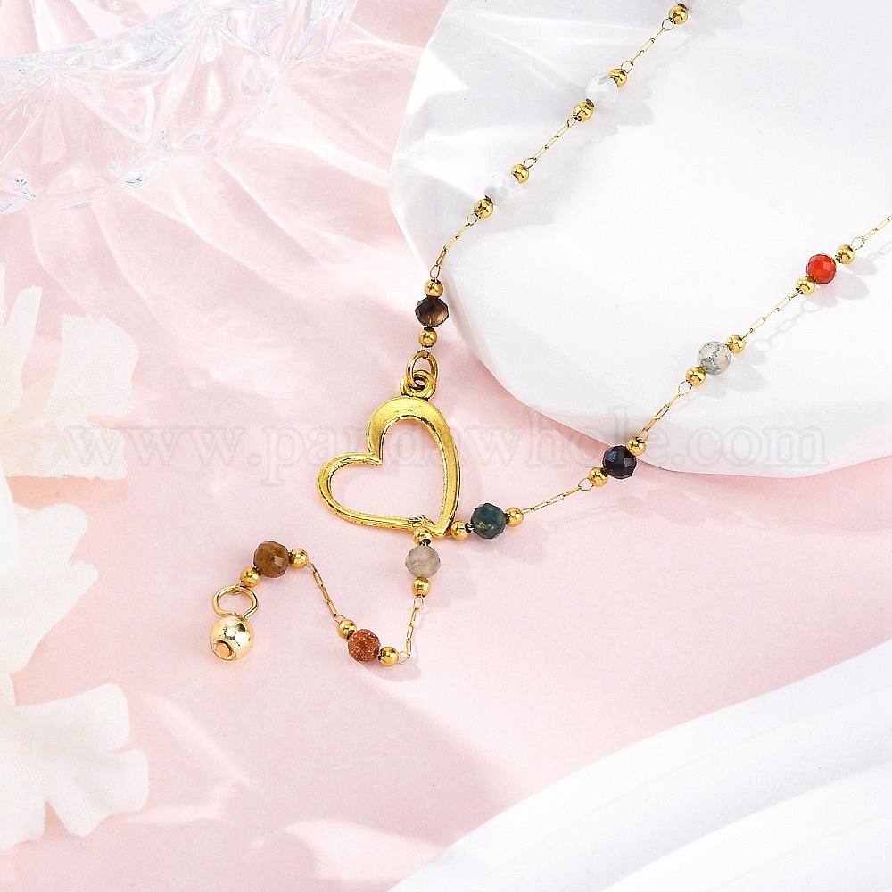 Регулируемые 304 ожерелья-лариаты из нержавеющей стали и граненых круглых смешанных драгоценных камней ручной работы, с подвесками из сплава в форме сердца