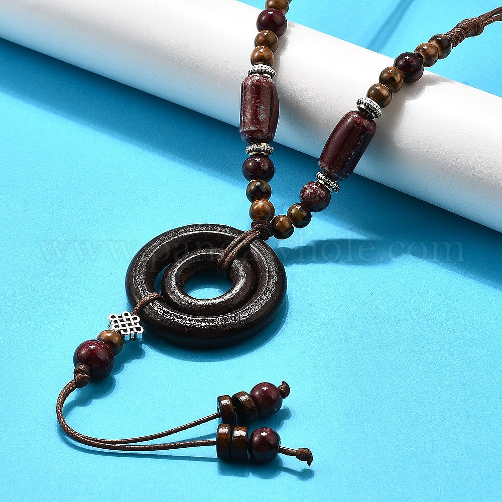 Этнический стиль сплав и фарфор керамические бусины и деревянные кольца подвеска кисточка и ожерелья, регулируемые вощеные ожерелья