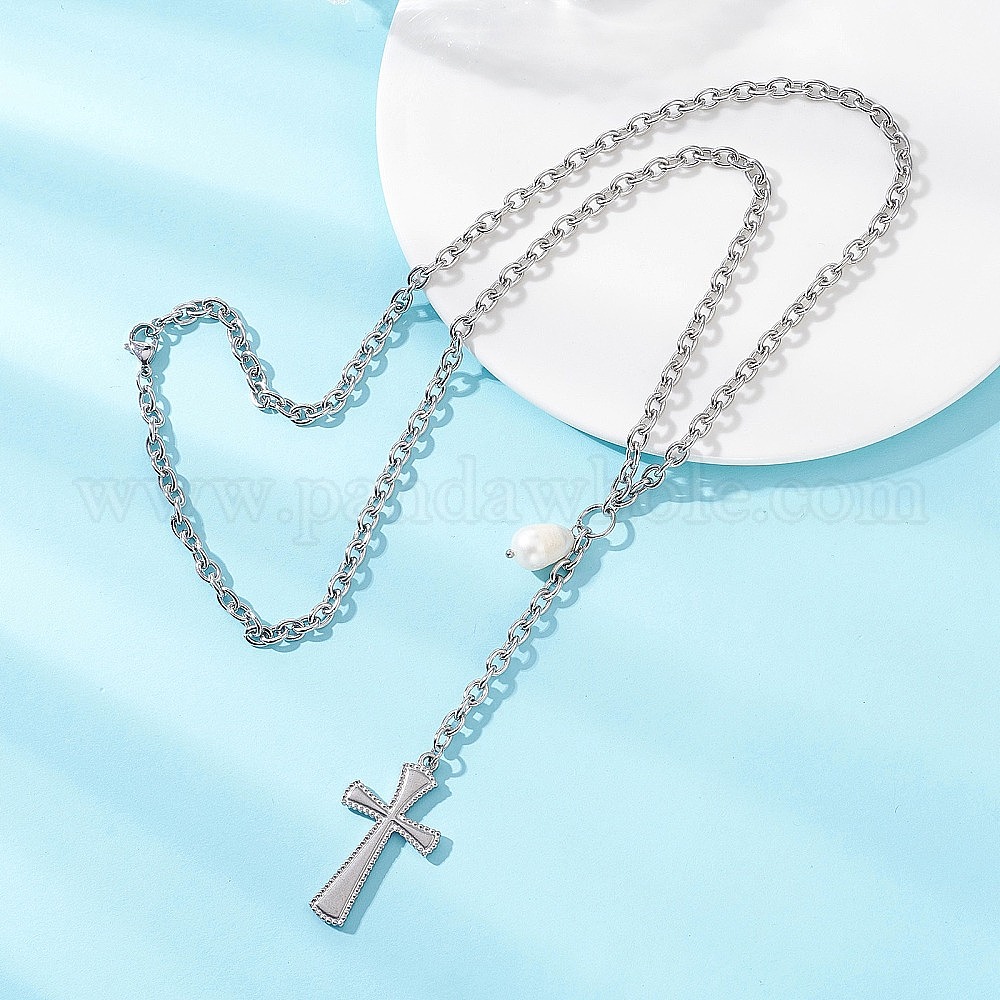 304 крест из нержавеющей стали с натуральным жемчугом риса, кулон на цепочке и ожерелье, цветочный белый