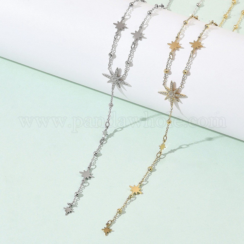 304 Длинное ожерелье с кисточкой и подвеской в виде звезды из нержавеющей стали с микропаве и прозрачными элементами, для женщин (03BTHA)