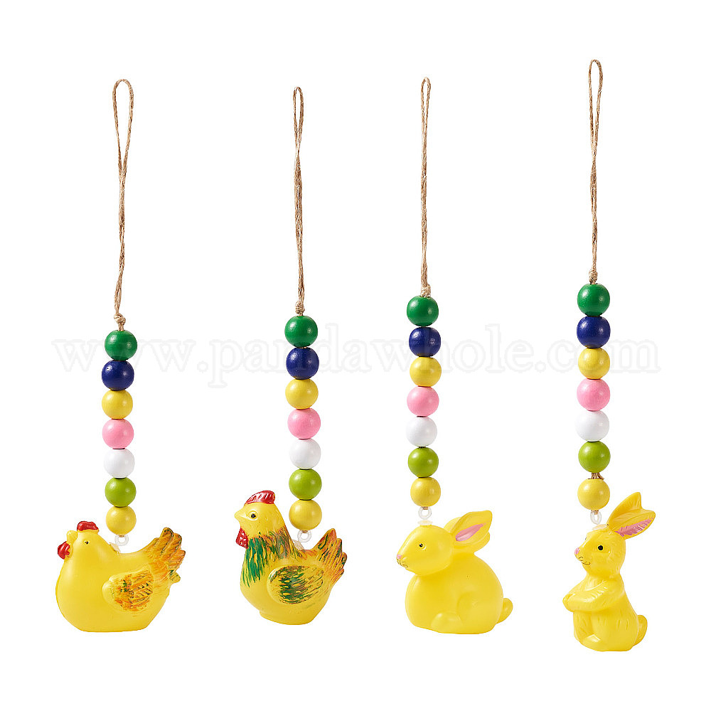 • Желтый 4шт 4 стиль пасхальная тематика пластиковые курица и кролик подвесные украшения, с пеньковой веревкой и деревянными бусинами, желтые, 240~282 мм, 1 шт / стиль