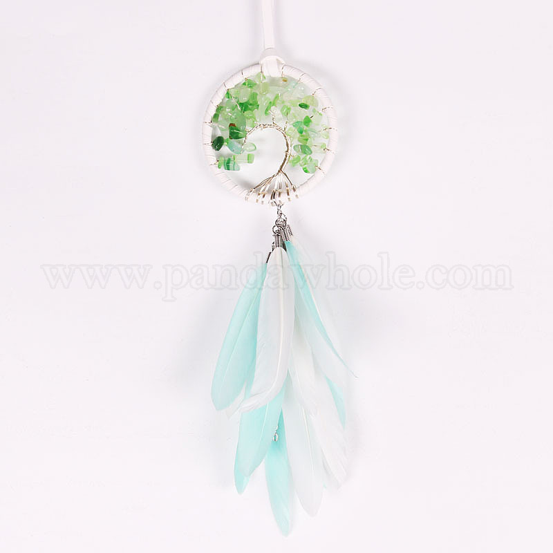 Плетеная сетка/паутина с подвеской из перьев, с волокном, бусины из драгоценных камней и медная проволока, плоские круглые с дерева жизни