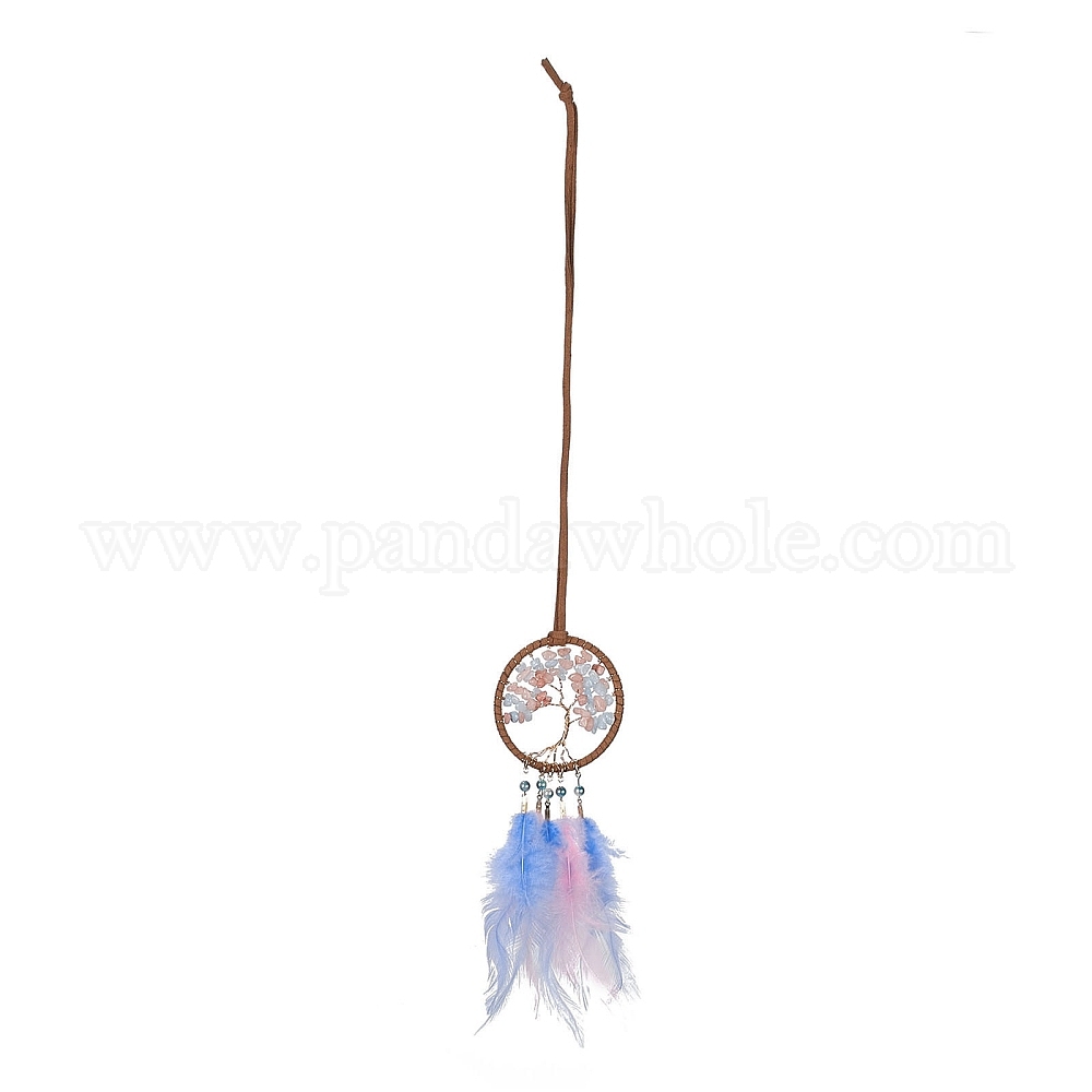 Железная тканая паутина/сетка с подвесками из перьев, с пластиковым, клубника кварца, аквамариновые бусы, обтянутый кожей и латунным шнуром, плоские круглые с дерева жизни