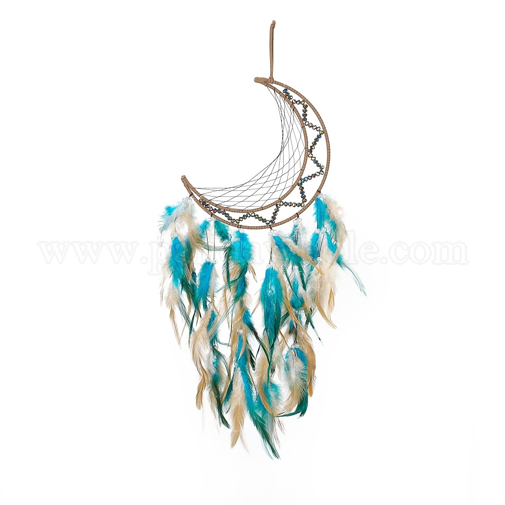 Тканая паутина/сетка из железного шнура с подвесками из перьев, с пластиковой бисера, обтянутый кожаным шнуром, луна