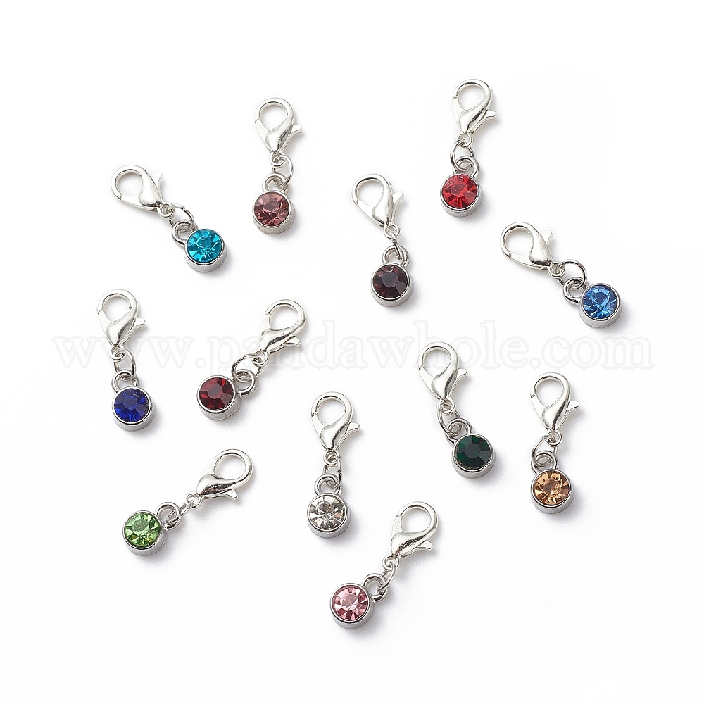 Кулон из сплава со стразами, подвески на клипсах, очарование месяца рождения, с цинковым сплавом застежками омаров коготь, плоско-круглые
