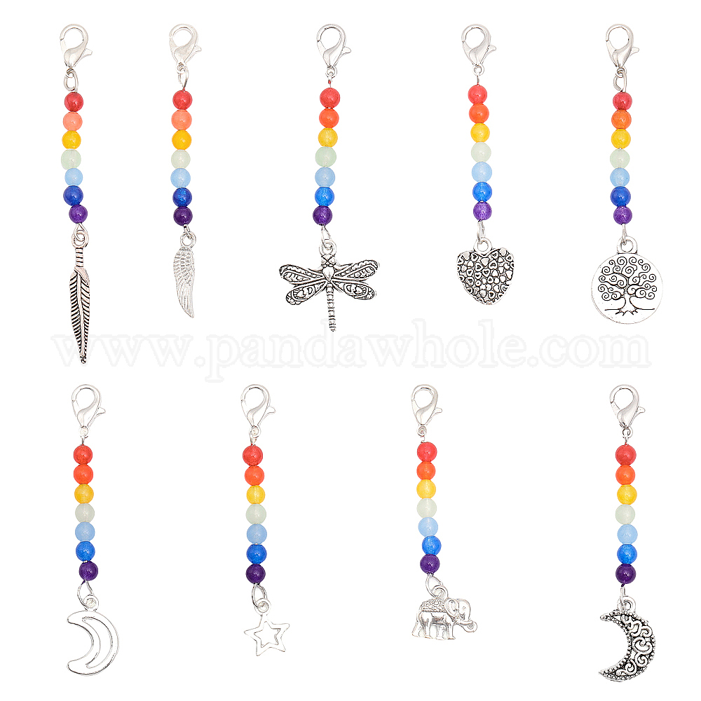 18 шт 9 стиль чакра тема натуральный и окрашенный малайзийский нефрит бусины подвеска украшения, с карабин-лобстерами , Сплавочные подвески тибетского стиля, перо/слон/стрекоза/сердце