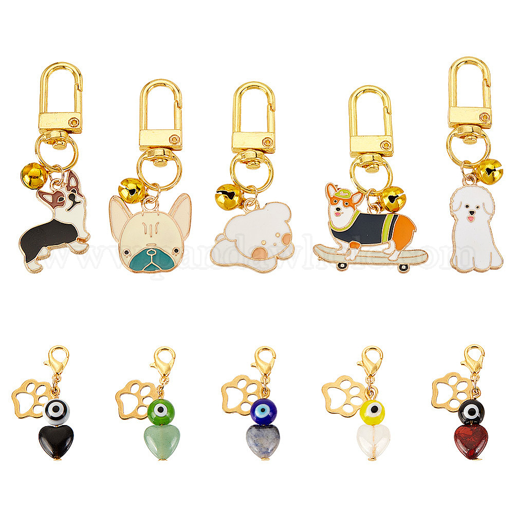 4 наборы 2 стильные украшения в виде латунного колокольчика в форме сердца из натурального драгоценного камня и эмалевой собаки, круглые подвески с застежкой-лобстером от сглаза, для брелка, кошелек, украшение для рюкзака (02GT7F)