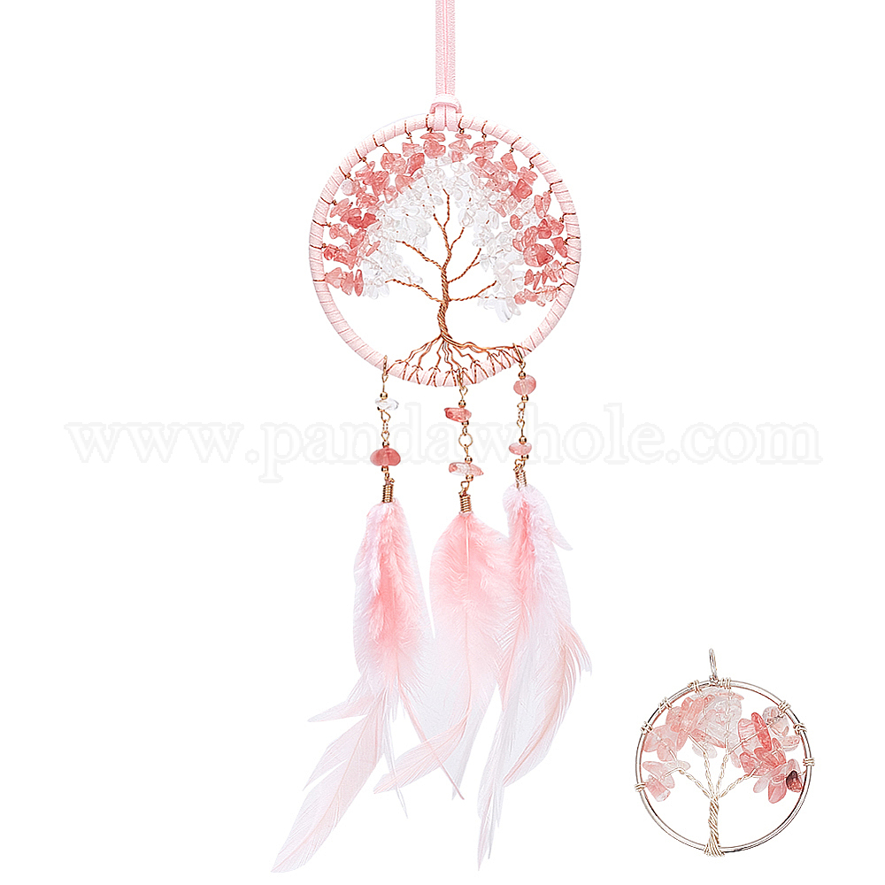 2шт 2 стиль латунная плетеная сетка/паутина с подвесными украшениями из перьев, с деревом жизни натуральный кристаллический кварц и синтетическая крошка вишневого кварцевого стекла