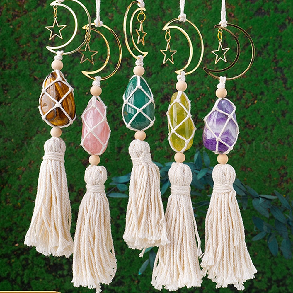Хлопок макраме ручной работы с подвесками из натуральных драгоценных камней, луна со звездой для внутреннего зеркала заднего вида автомобиля подвесной орнамент