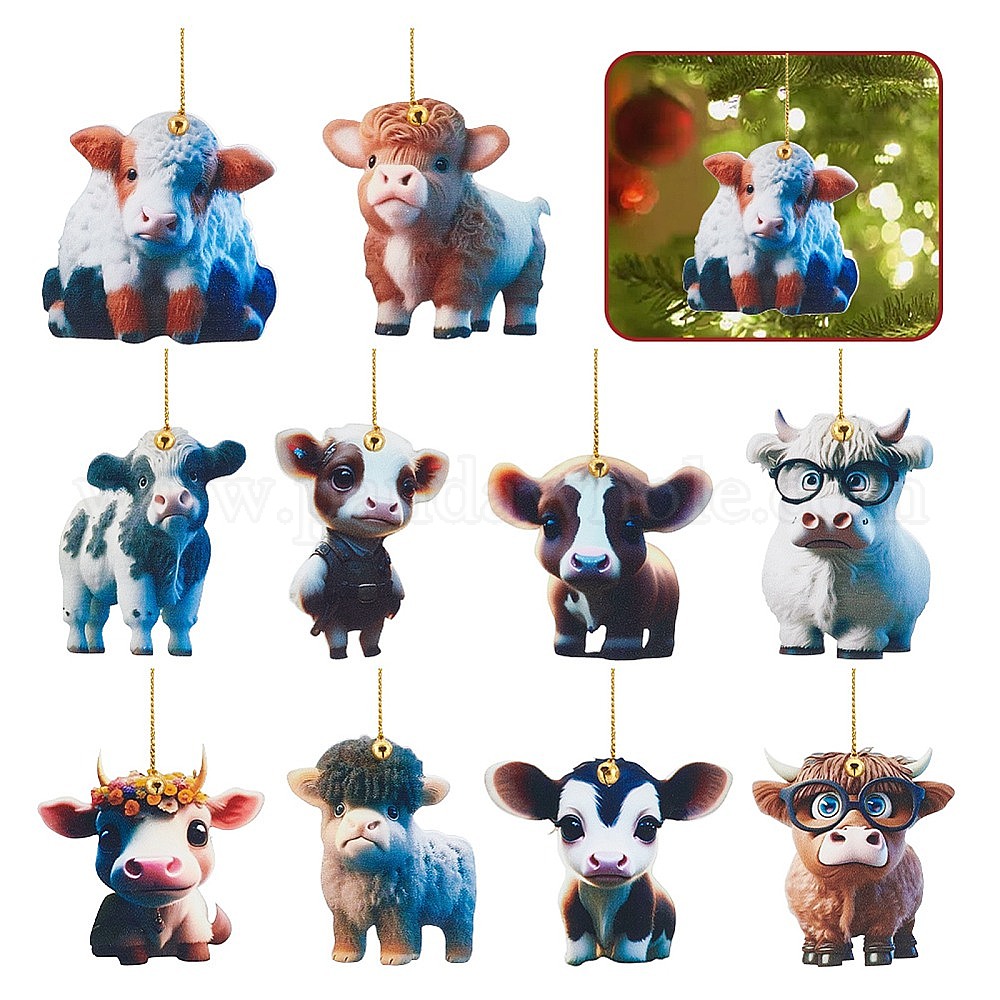 10 шт 10 стили мультяшный скот акриловые подвесные украшения, со шнуром и латунным колокольчиком, для автомобильных подвесных украшений