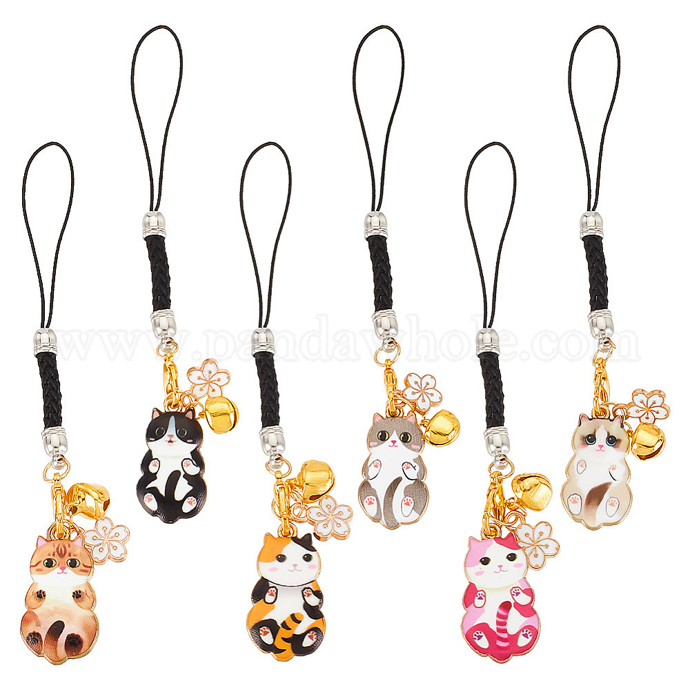 6 шт. 6 цвета, подвеска из эмали из сплава с изображением кота и цветка, украшение, с железным подвеском-колокольчиком и нейлоновыми петлями для подвешивания шнура