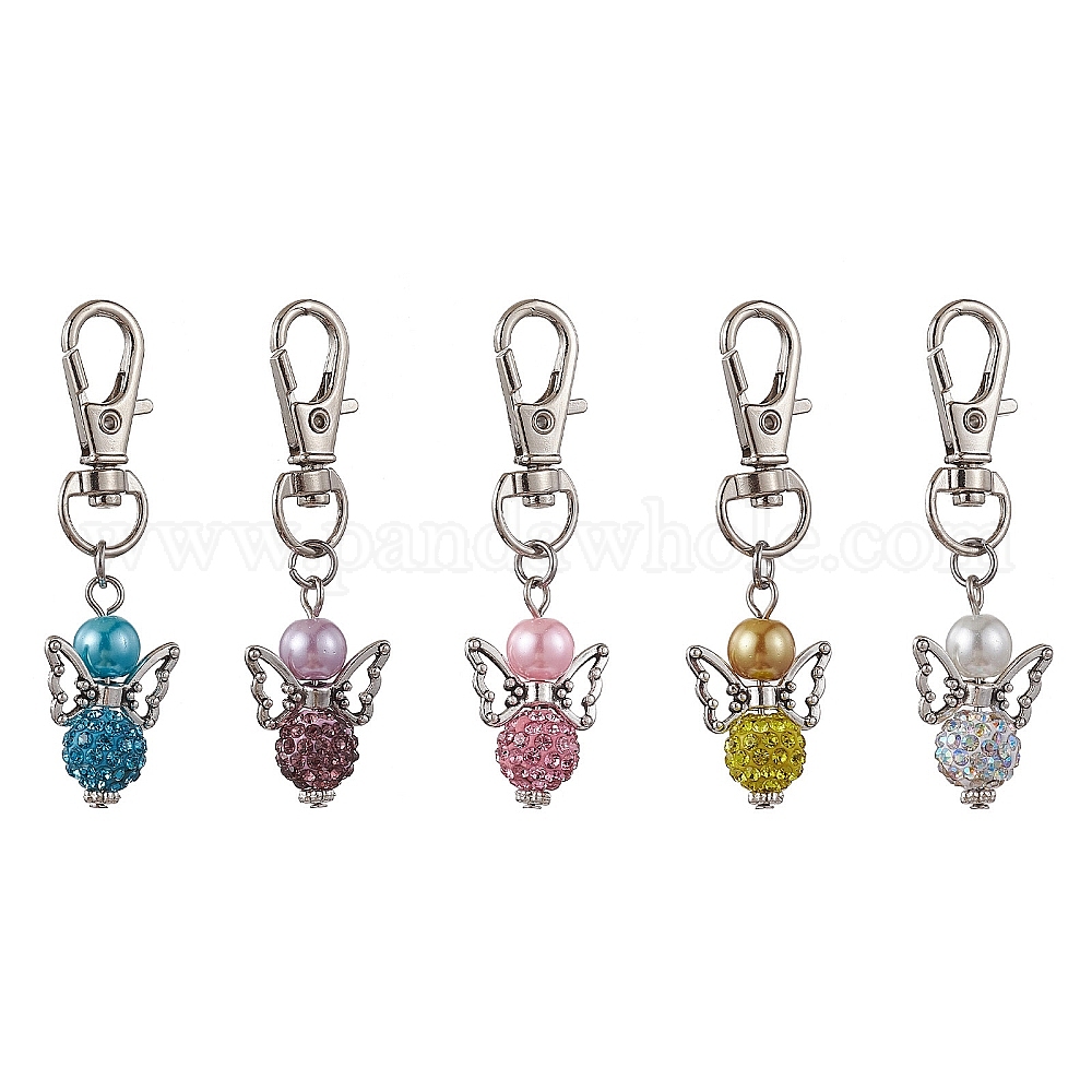 5шт 5 цвета ангела полимерная глина подвеска со стразами украшения, со стеклянными жемчужными бусинами и поворотными застежками-карабами из сплава