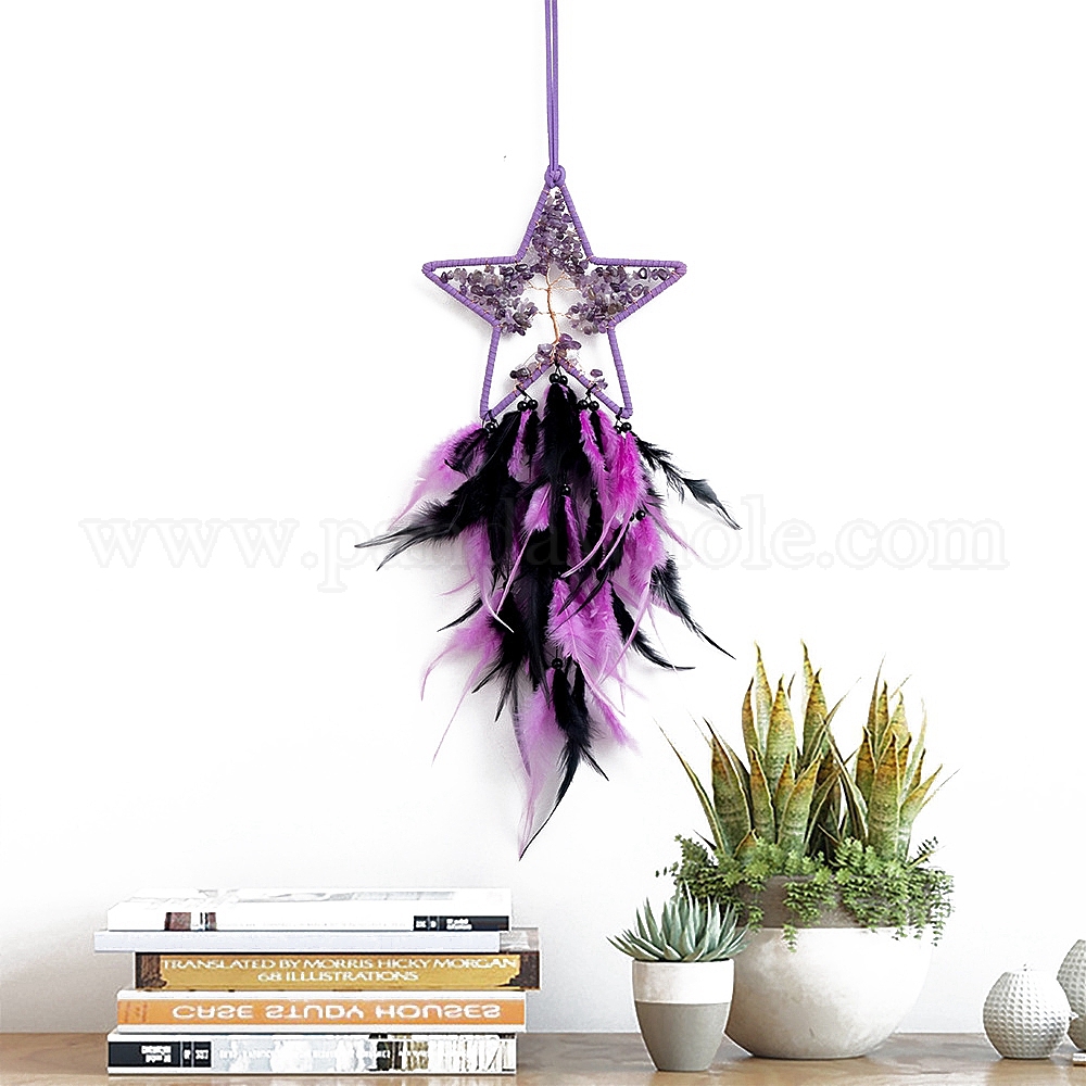 Звезда из натурального аметиста, обернутая проволокой, с подвесными украшениями в виде древа жизни, Тканая сетка/паутина с перьями для домашнего настенного декора