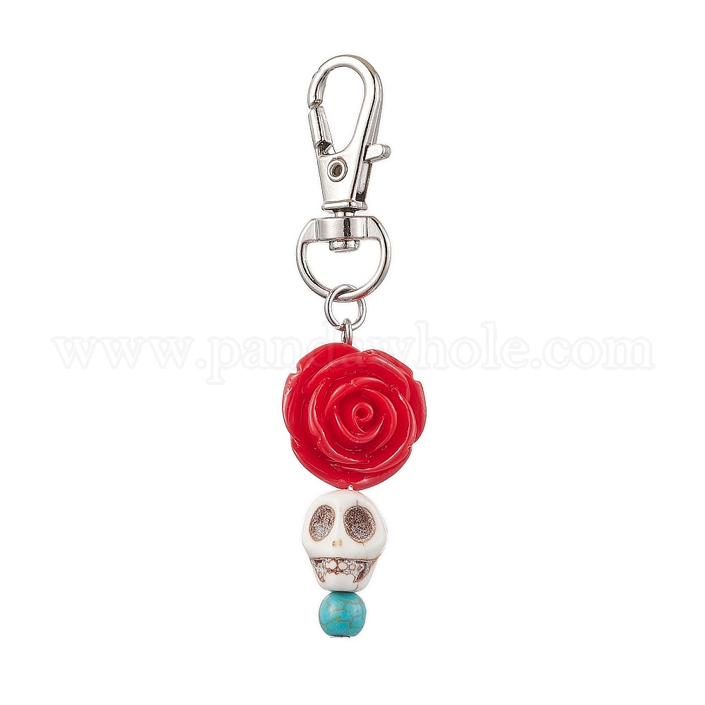 • Платина Подвеска из смолы и синтетической бирюзы с черепом и розой, украшение, Поворотные застежки-лобстеры из сплава для украшений сумок, платина, 72 мм