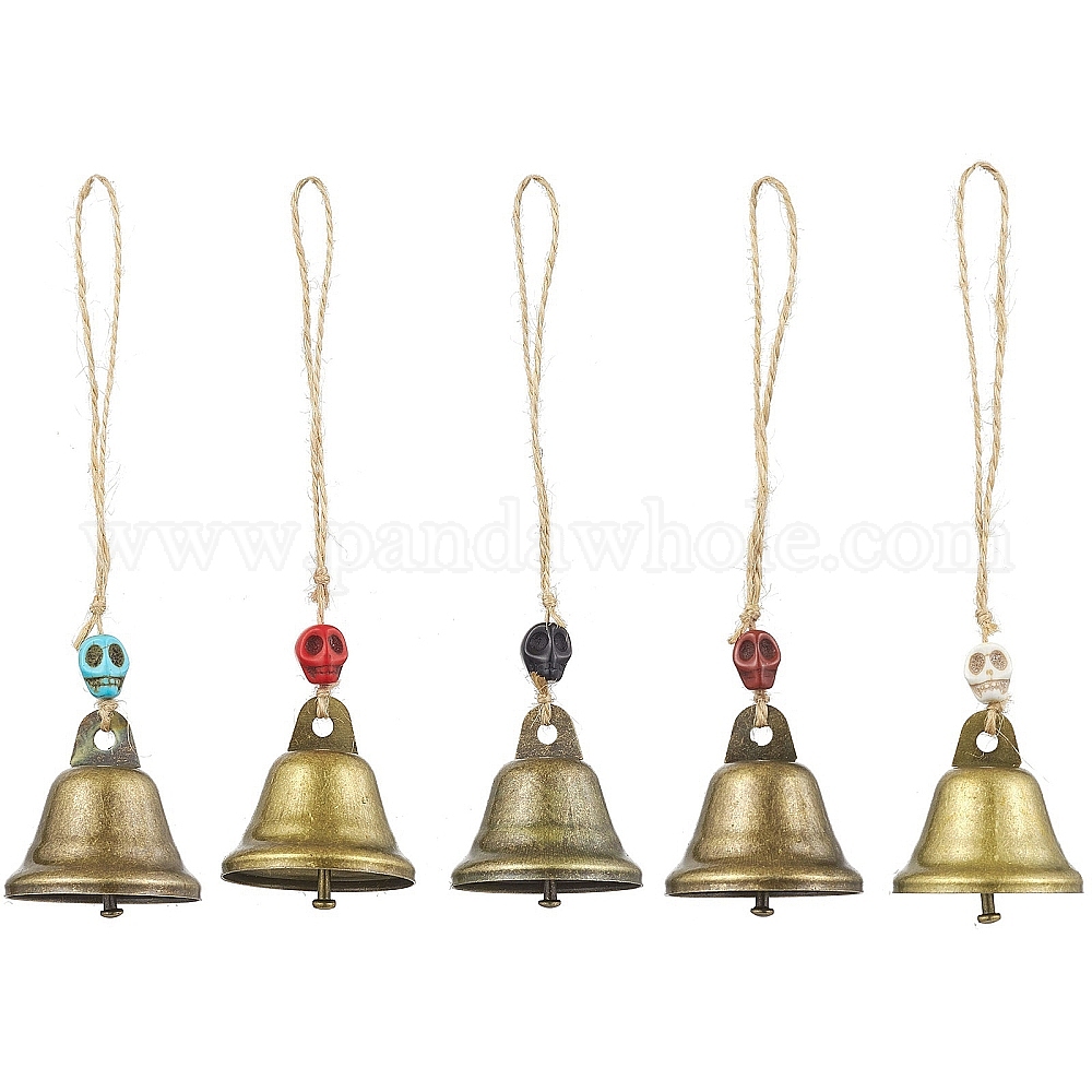 Железо колокол подвесные украшения, черепа из синтетических бирюзовых бусин и подвесных украшений из джутового шнура