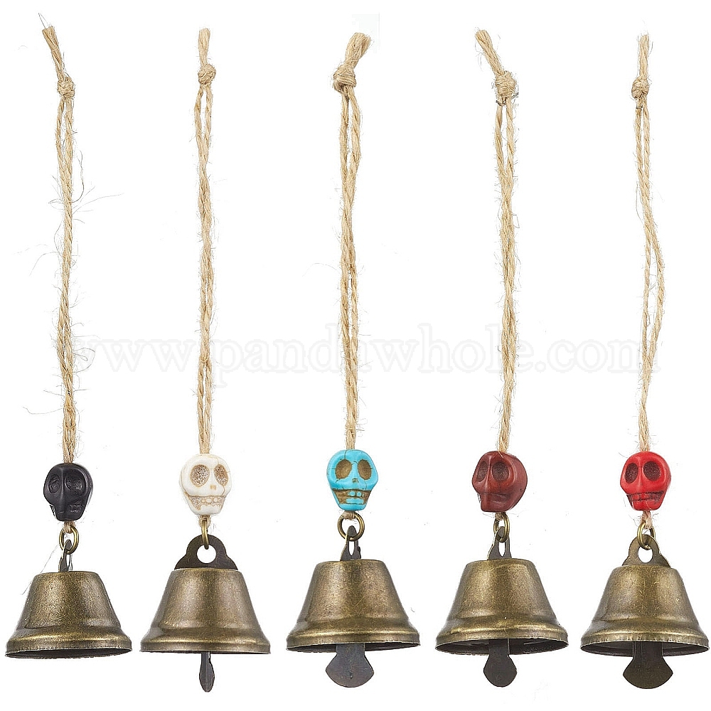 Железо колокол подвесные украшения, черепа из синтетических бирюзовых бусин и подвесных украшений из джутового шнура