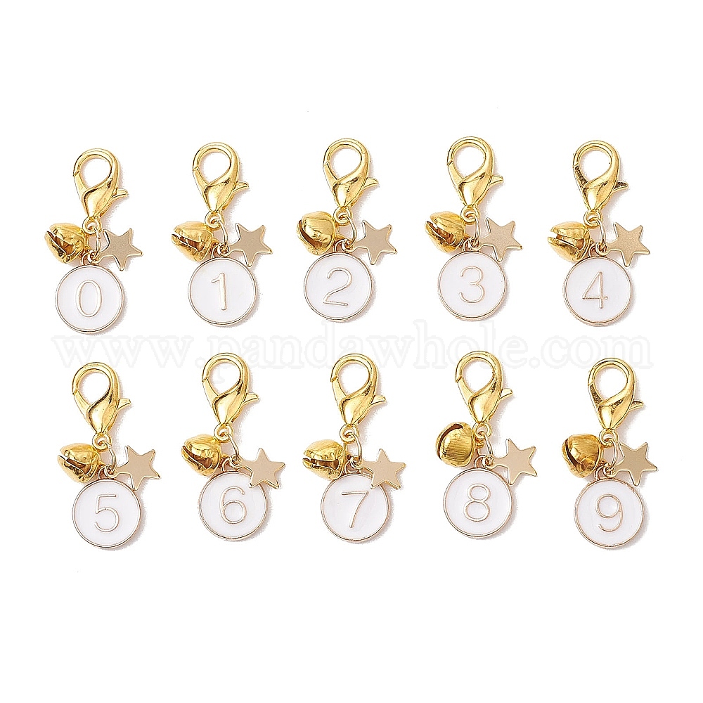• Белый Плоские круглые с цифрой 0~9 сплав эмали подвесные украшения, с цинковым сплавом застежками омаров коготь, белые, 33 мм, 10 шт / комплект