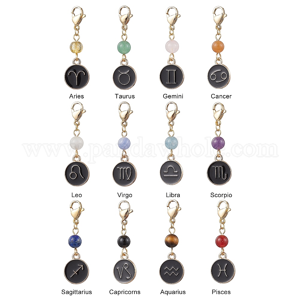 12шт. сплав эмали плоский круглый с 12 созвездиями подвесные украшения, натуральные и синтетические драгоценные камни и застежки-клешни лобстера подвески украшения